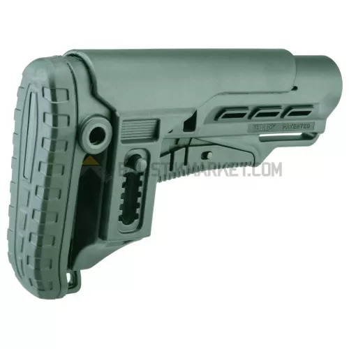 Rahat bir yerleşim sağlayan entegre kauçuk dipçik pad'i geri tepmeyi azaltır ve kaymayı önlemek için güvenli bir omuz tutuşu sağlar, vücut zırhı veya modüler ekipmanla bile.