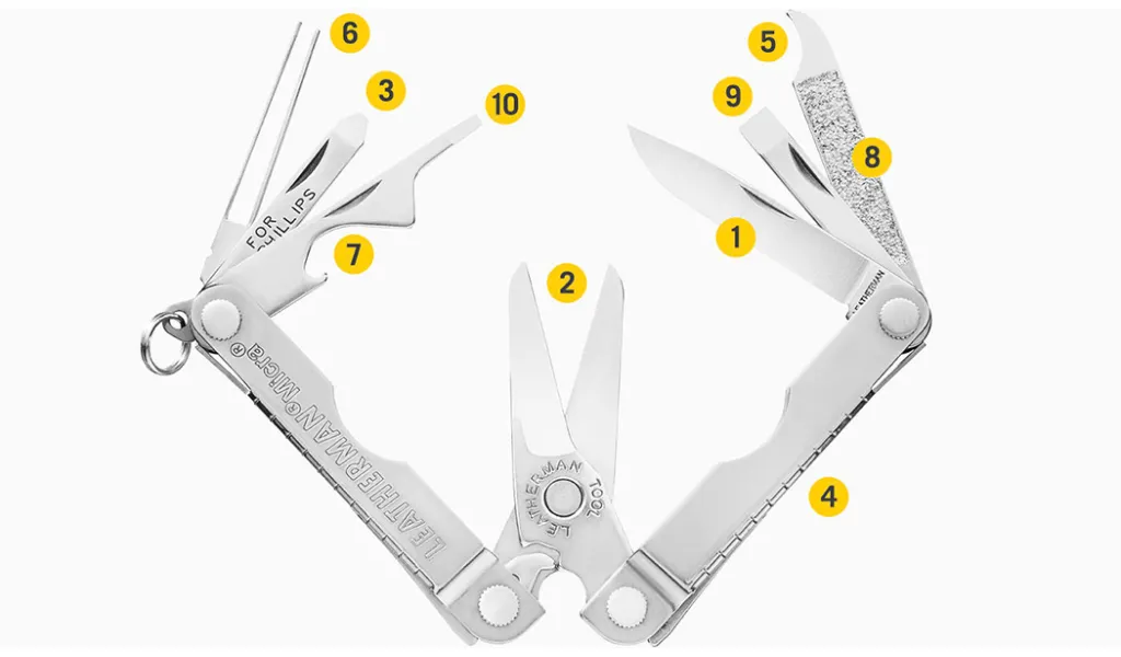 1. 420HC Bıçak, 2. Yaylı Makas, 3. Düz/Phillips Tornavida, 4. Cetvel (4.7 inç | 12.0 cm), 5. Tırnak Temizleyici, 6. Cımbız, 7. Şişe Açacağı, 8. Tırnak Törpüsü, 9. Orta Boy Tornavida, 10. Ekstra Küçük Tornavida